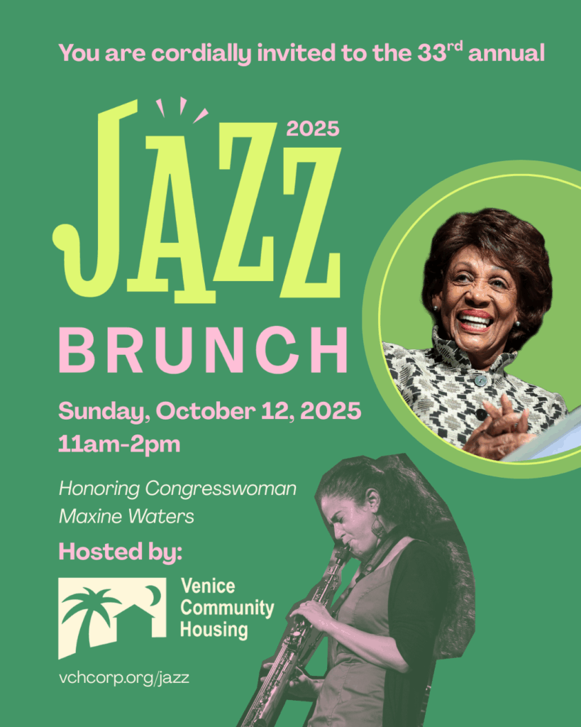 Support Venice Community Housing’s mission while enjoying live music, great food, and meaningful connection, as we present the inaugural Courage in Action Award to Congresswoman Maxine Waters. This year’s Jazz Brunch will be held on Sunday, October 12th, 2025, from 11am-2pm, at Above the Block (11301 W Olympic Blvd., Suite 301, Los Angeles, CA 90064). For information on sponsorships, advertising, silent auction donations, or general questions, please visit vchcorp.org/jazz or contact our team at [email protected].
